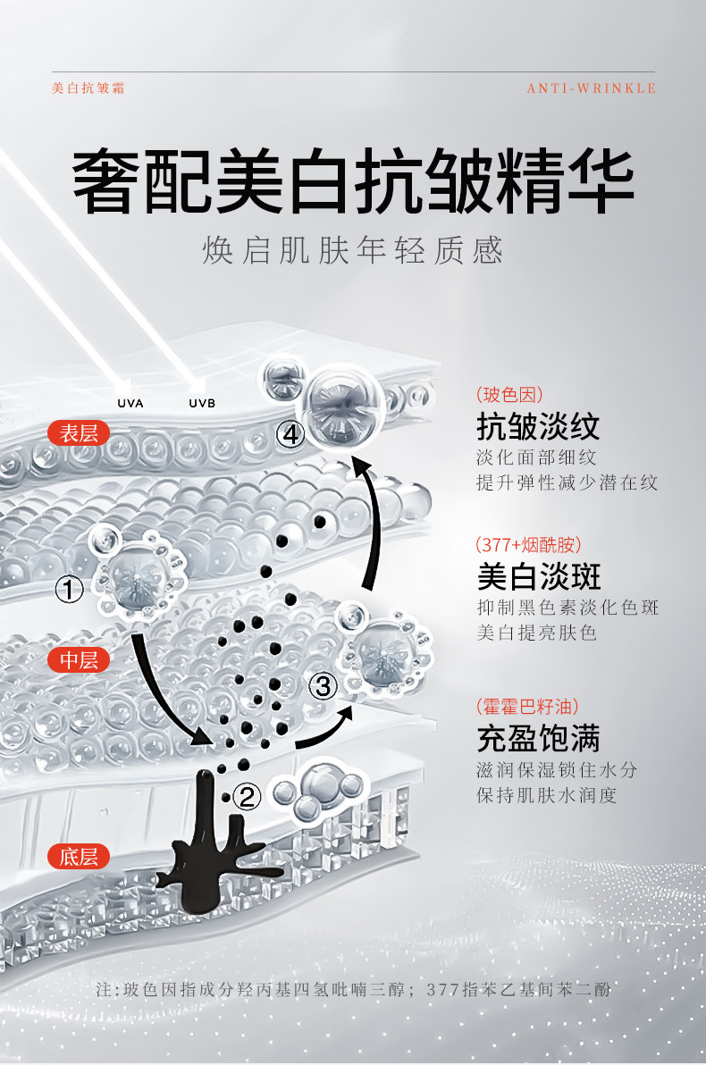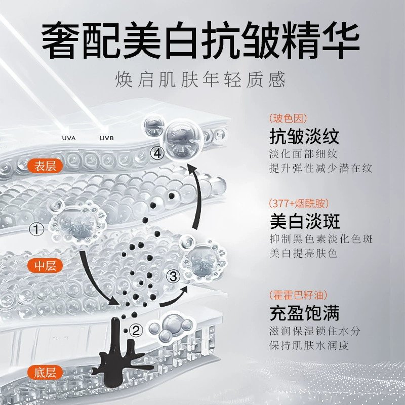 奢配美白抗皺精華,深入肌膚底層,精準狙擊黑色素,12倍亮白力,直擊4重斑印,深層改善,抗皺去紋,提亮膚色