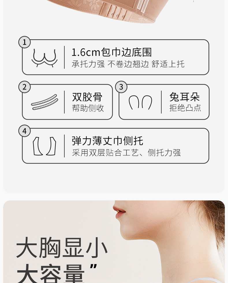 不擠不勒,也能穿出完美胸型,防凸顯瘦+全罩杯包覆,一穿立現平順胸型,小胸變自然、大胸變精緻,身形更俐落