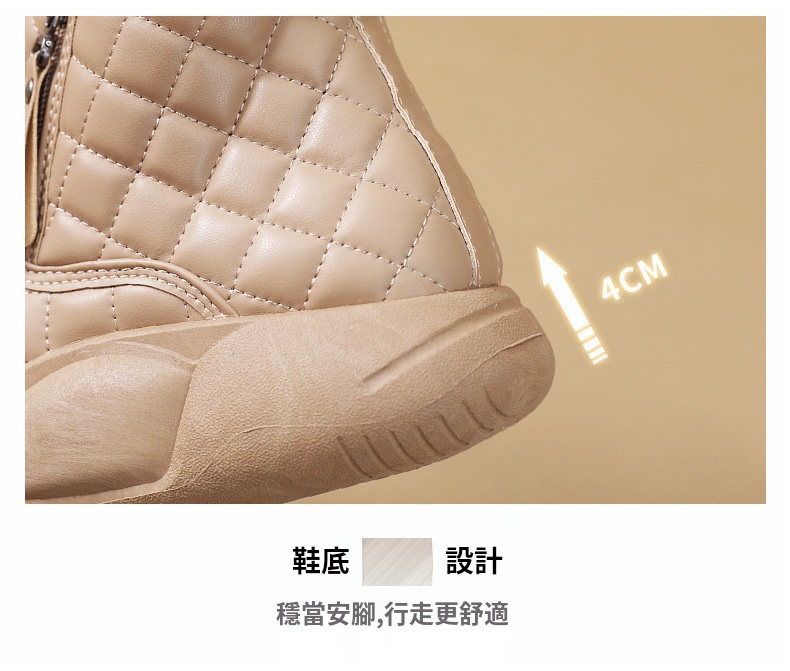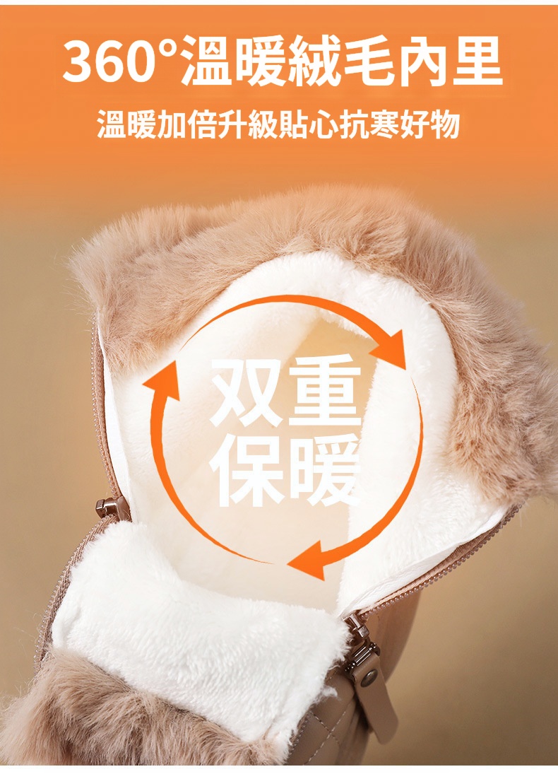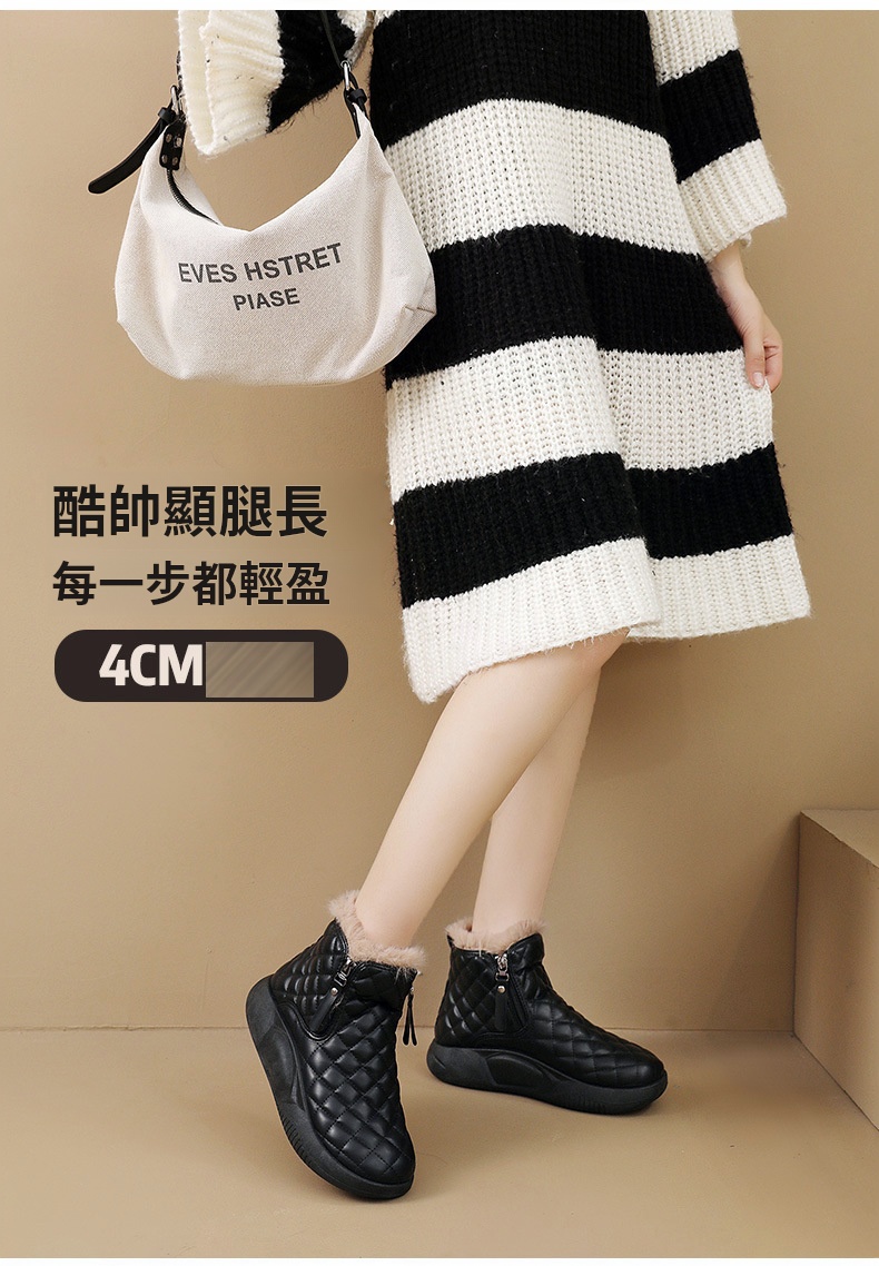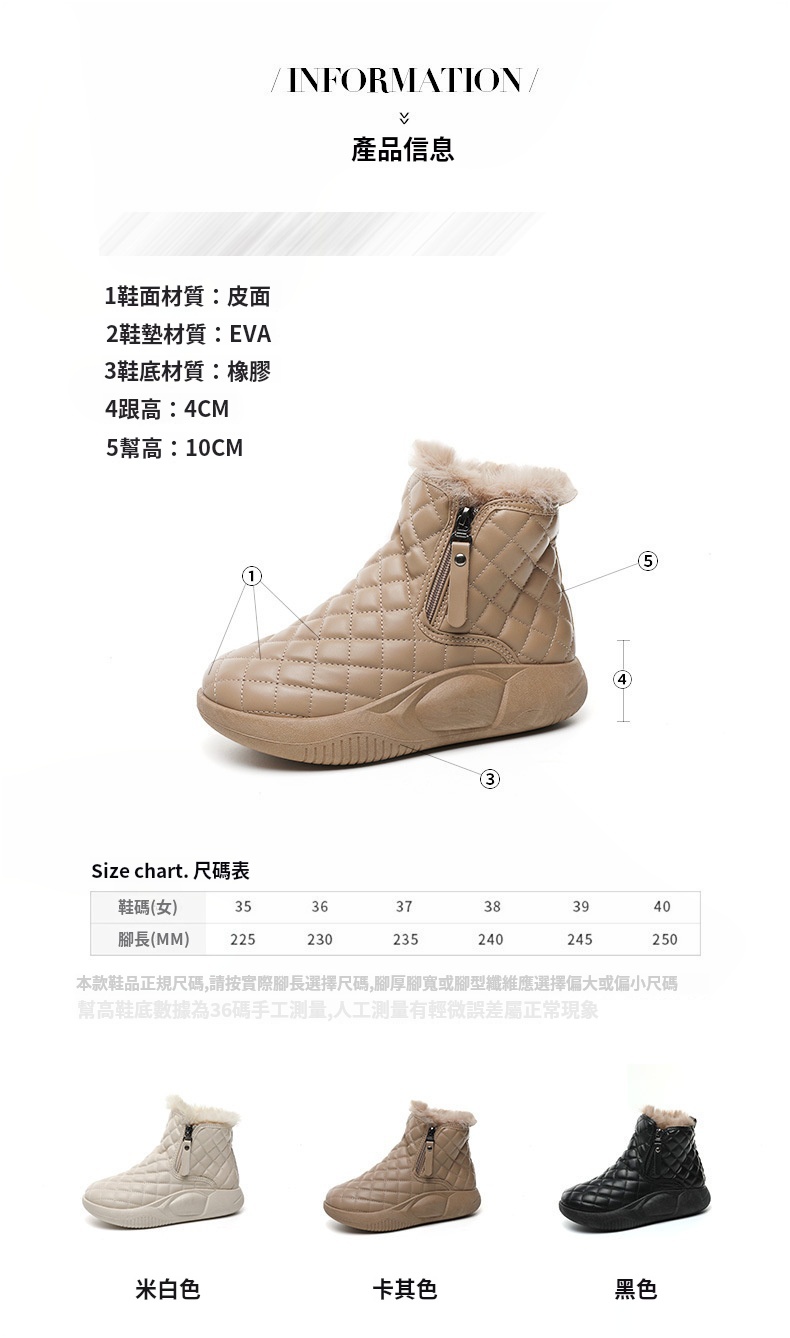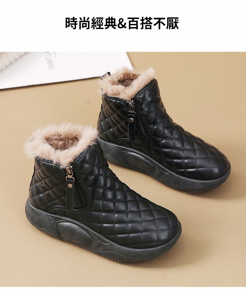 厚實羊羔絨內裡,赤腳穿也暖,荷葉式防潑水塗層,雪水、雨點一擦即乾,時尚百搭