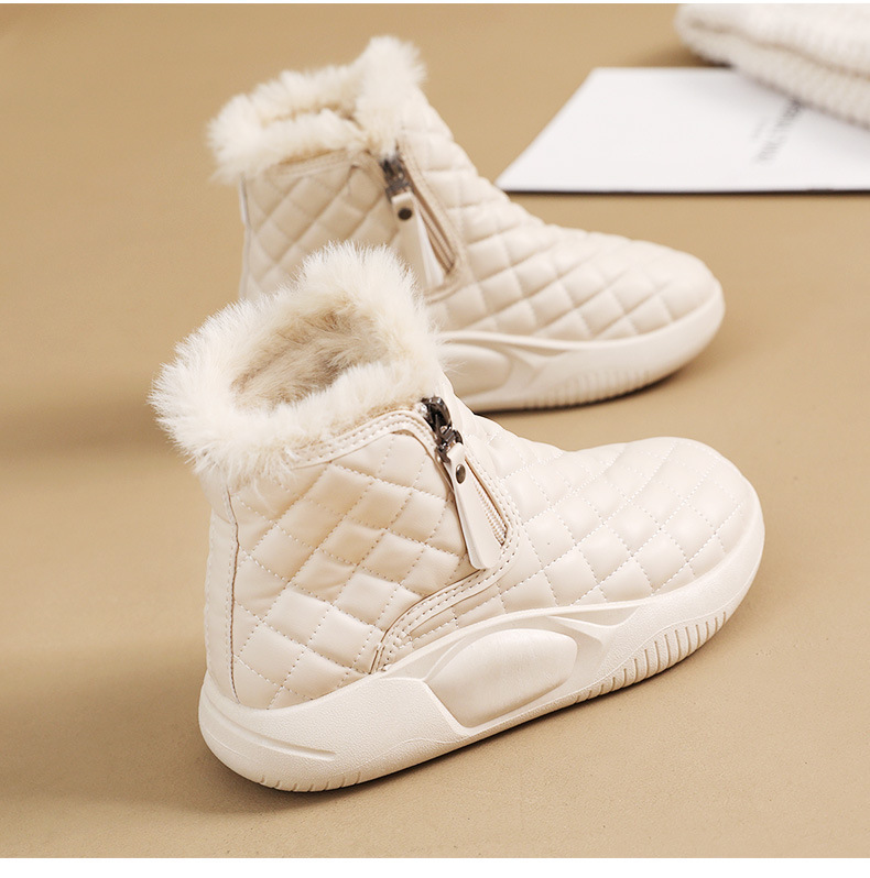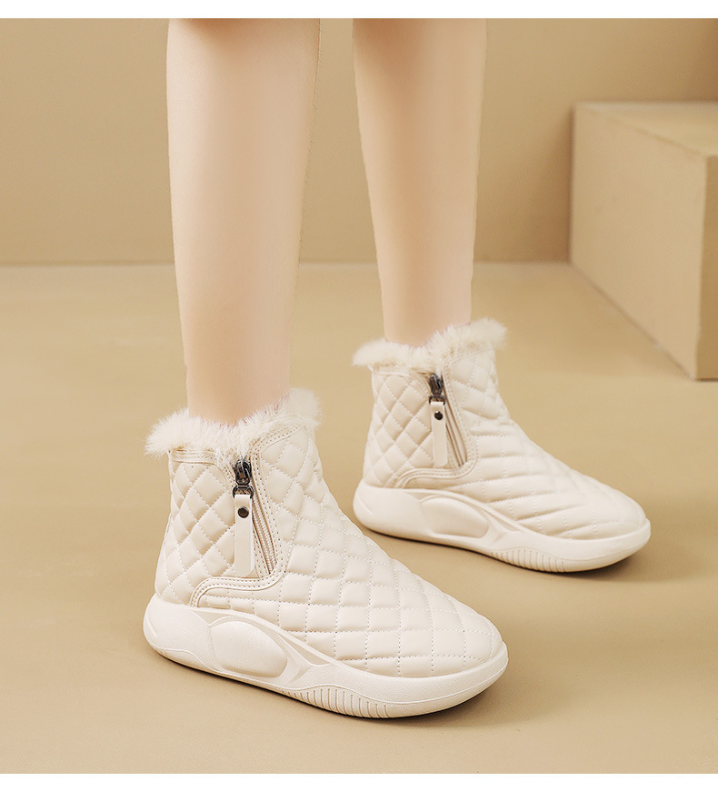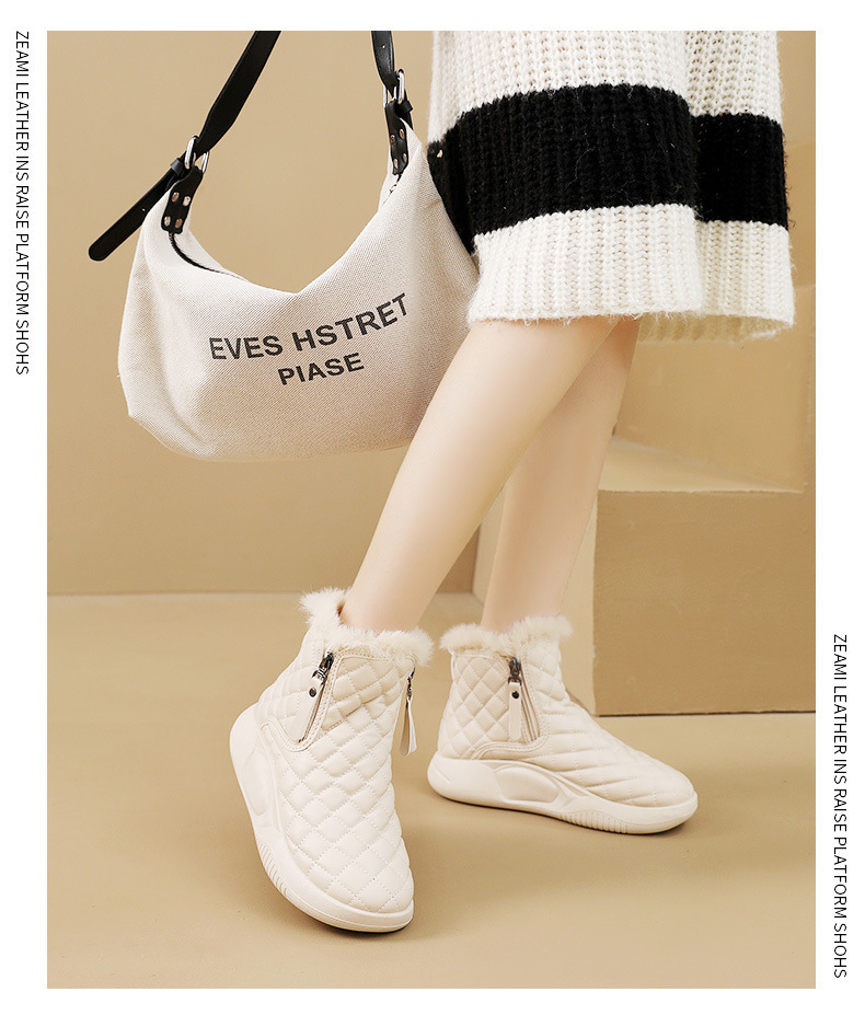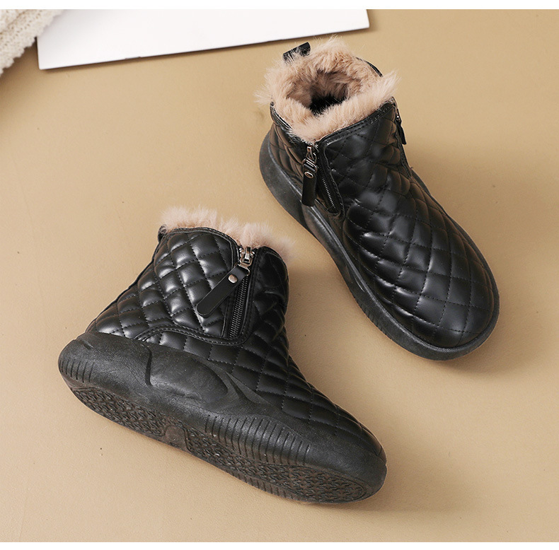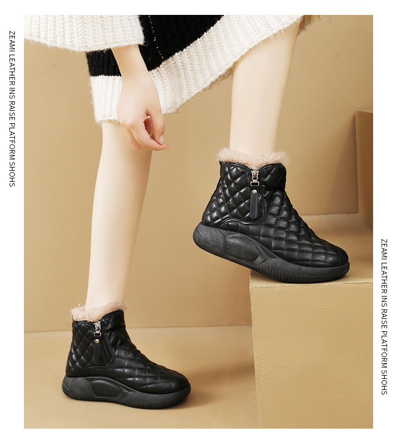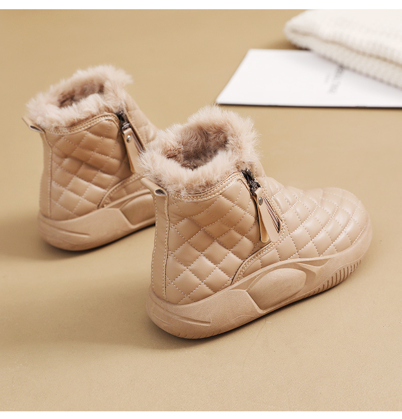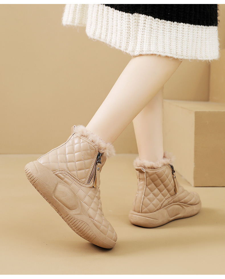 厚實羊羔絨內裡,赤腳穿也暖,荷葉式防潑水塗層,雪水、雨點一擦即乾,時尚百搭