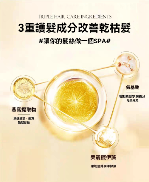燕窩酸+17種氨基酸,重建發芯鋼筋結構,角蛋白納米滲透,炸毛秒變垂順瀑布,72小時鎖水膜,吹風機高溫也不怕