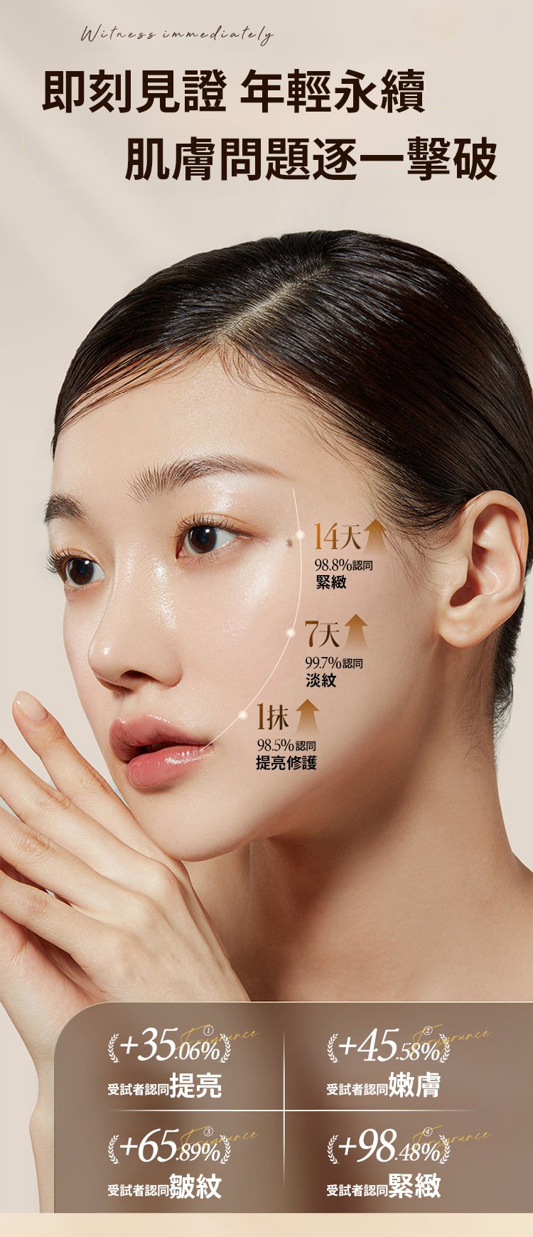 深層改善,抗皺去紋,提亮膚色,美白淡斑,滋潤保濕 ,消除眼袋,使斑點逐漸淡化,肌膚緊緻有彈性