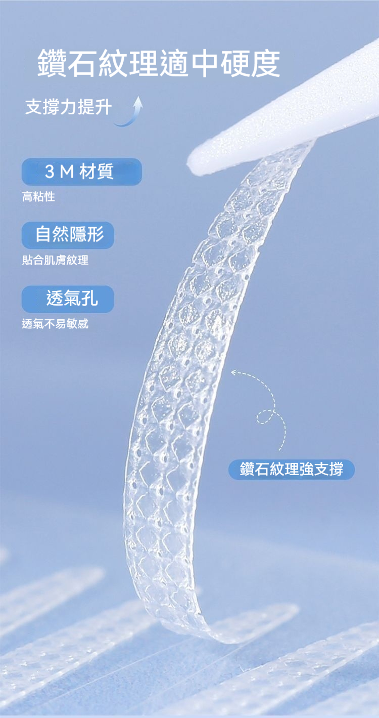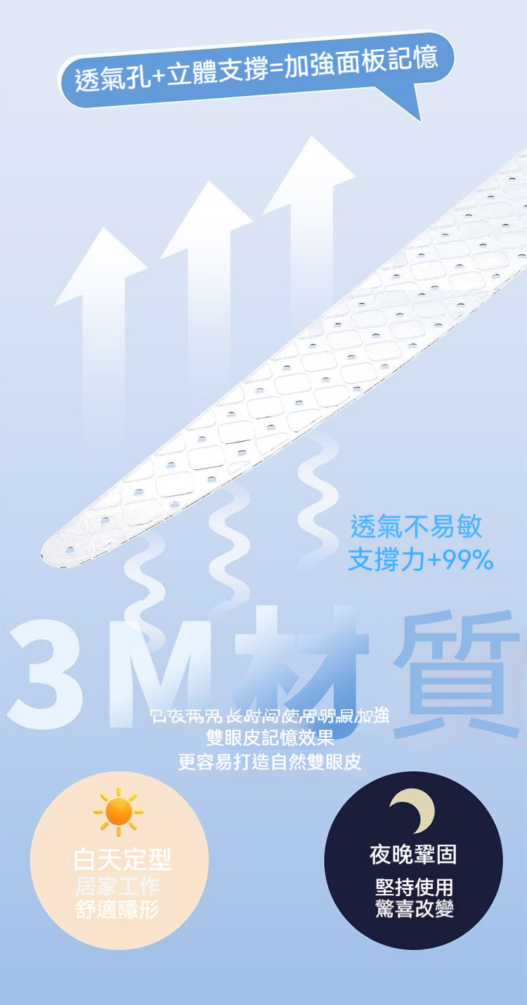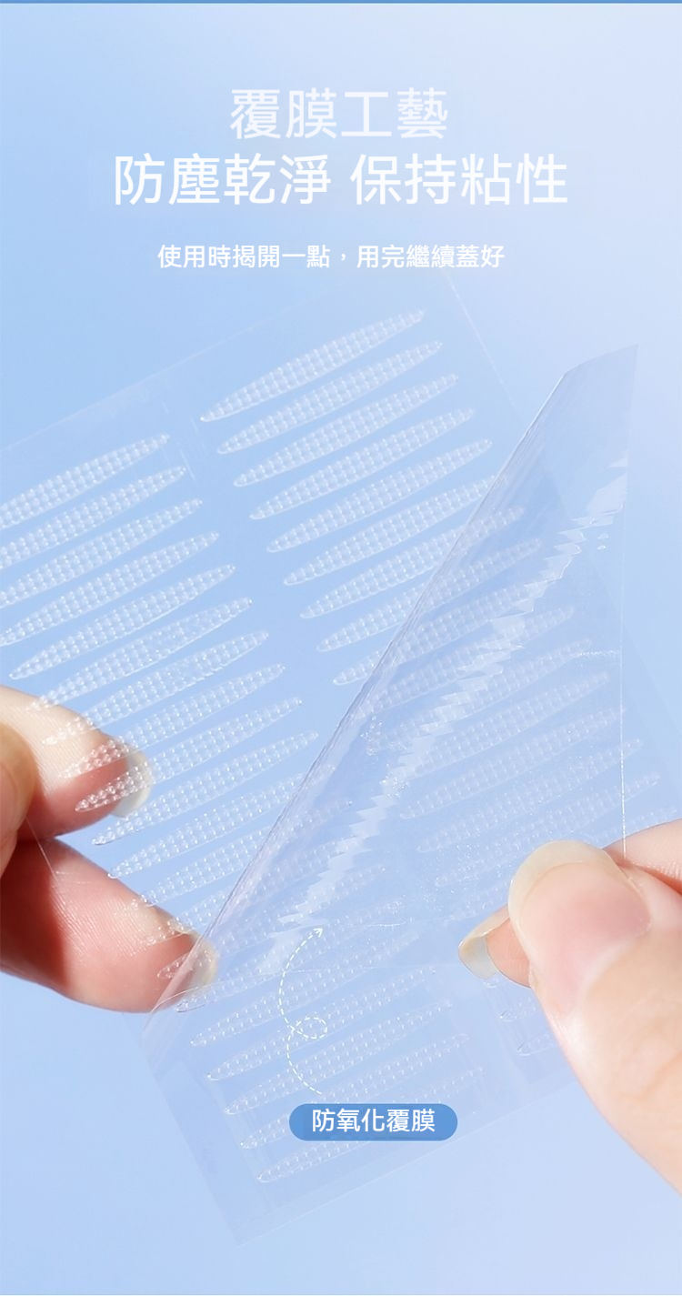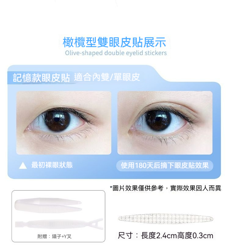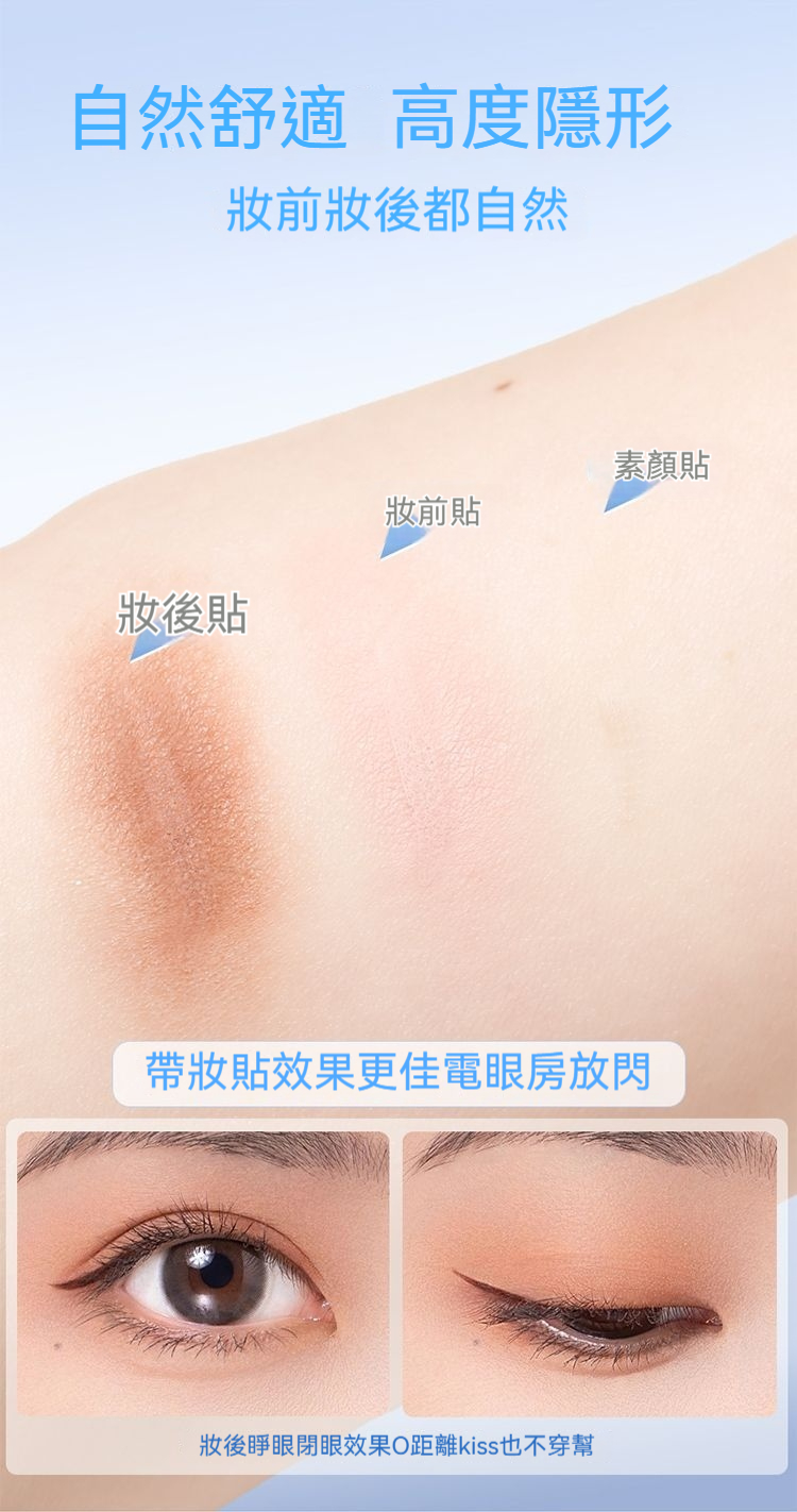 日夜雙重護理:白天貼上自然定型,隱形舒適不突兀;夜晚睡眠時鞏固記憶,堅持使用幫助眼皮形成自然雙眼皮褶皺。